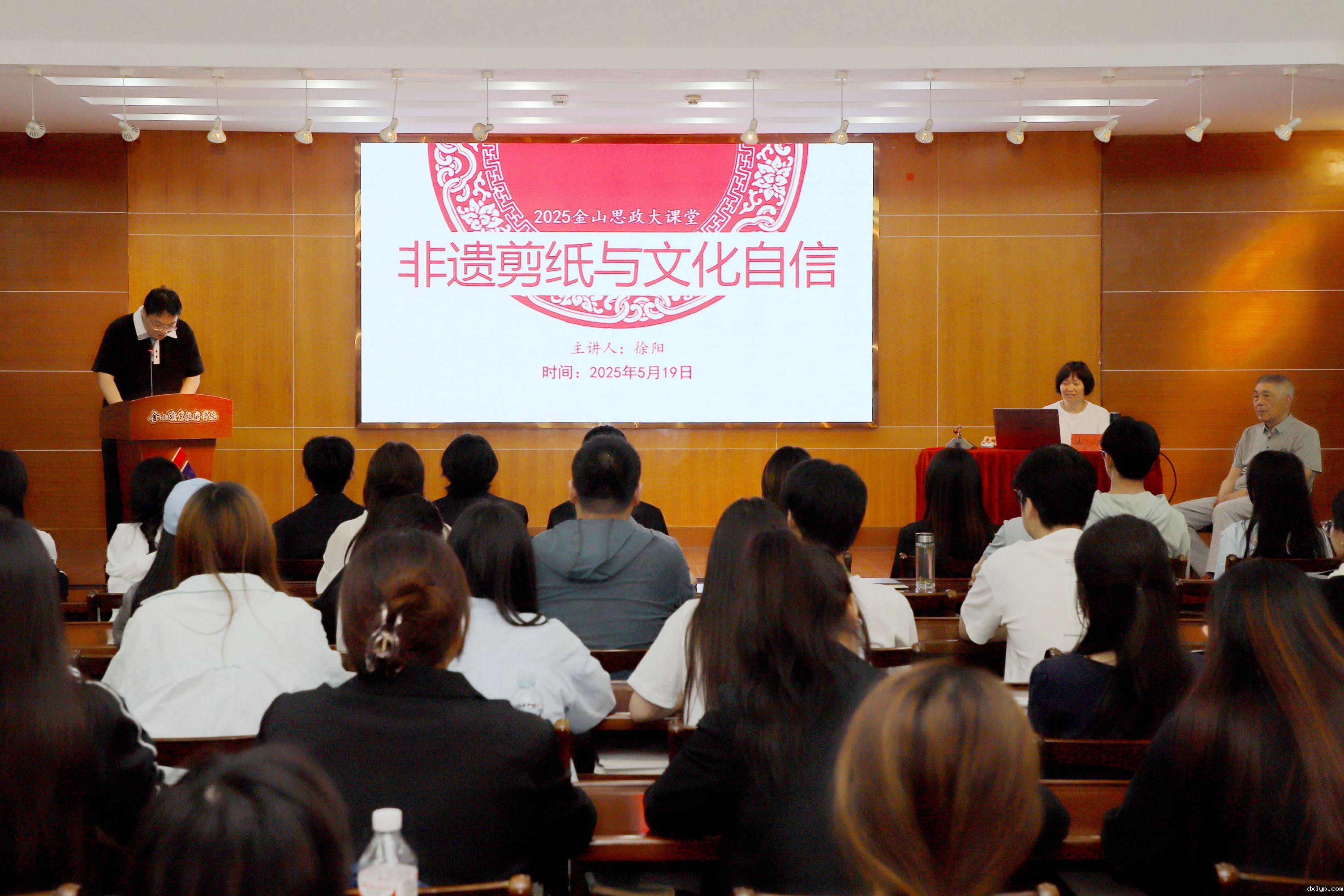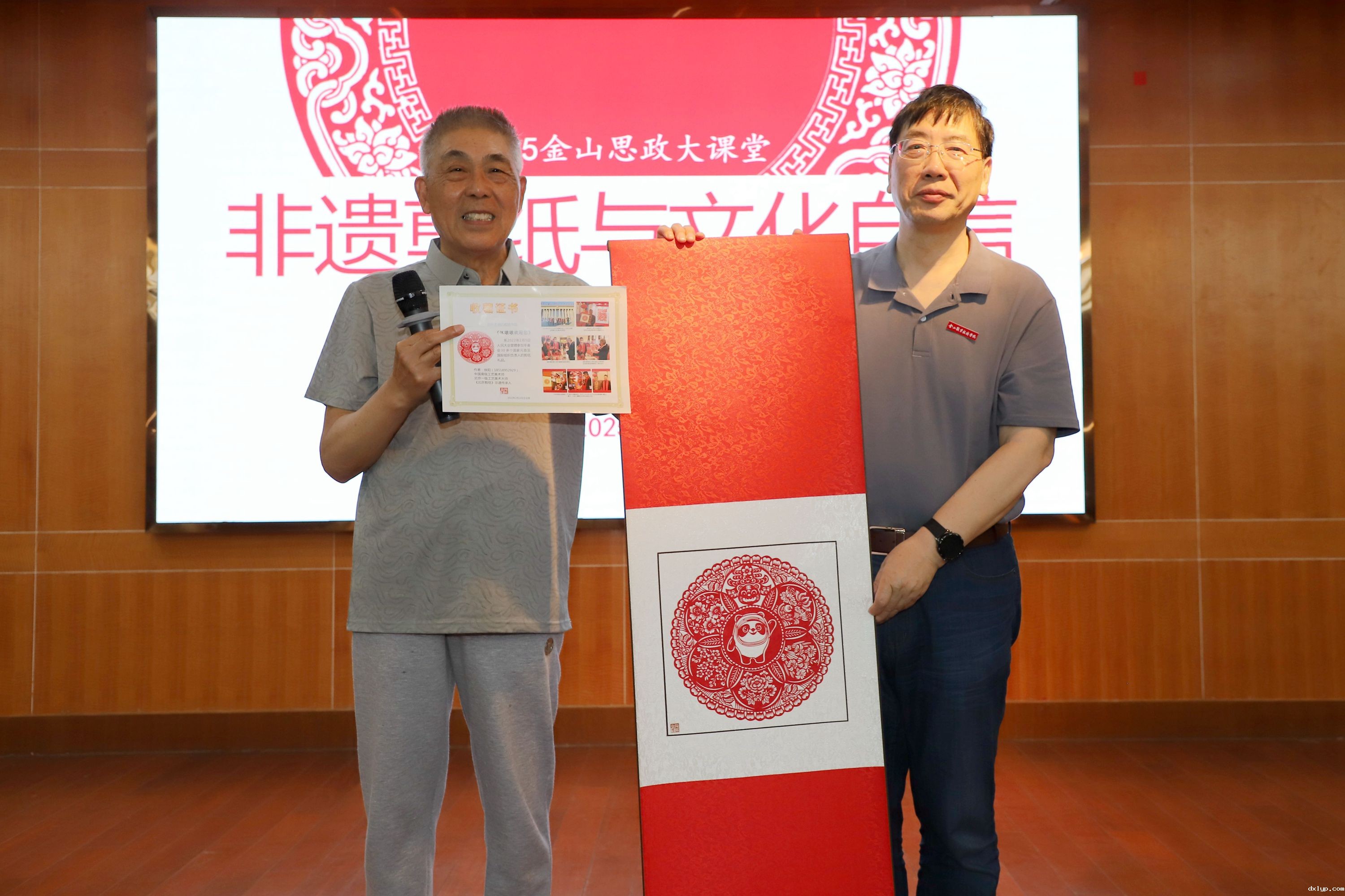 徐阳大师移步江声楼三楼会议室,为我校师生代表作题为《非遗剪纸与文化自信》的专题报告。他从一张红纸、一把剪刀的千年历史讲起,结合自身从学徒到国家级传承人的成长故事,诠释剪纸艺术中蕴含的“天人合一”“虚实相生”等中华哲学智慧。