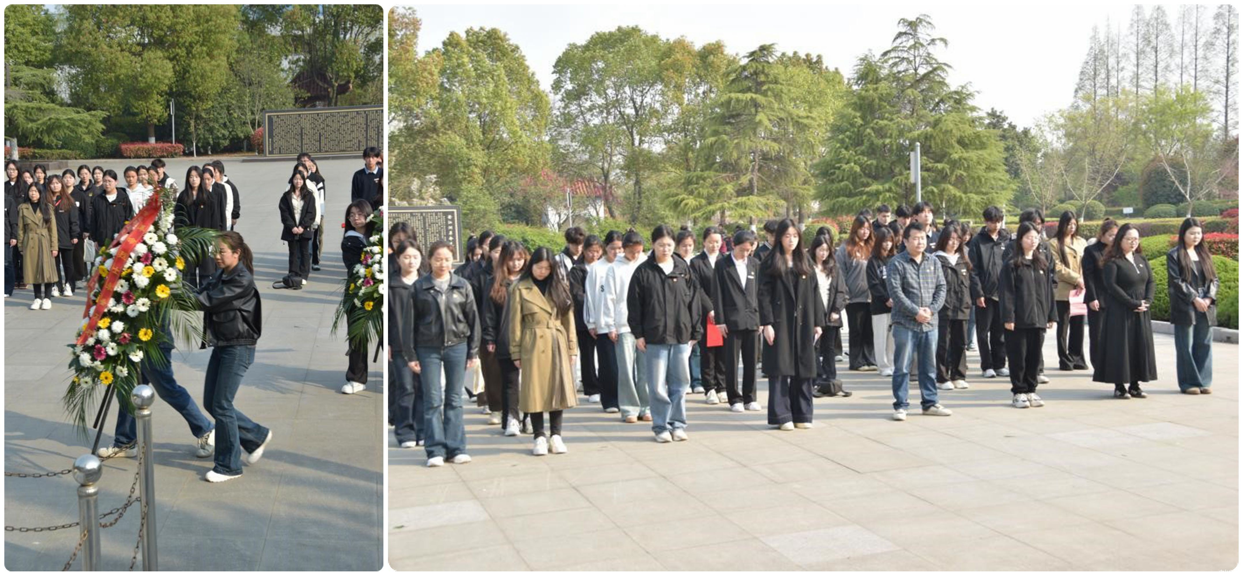 仪式上,经贸党支部书记郑婕同志、纪律委员袁杰同志以及两名学生代表托起素洁花圈,缓步走到纪念碑前敬献,并仔细整理缎带。