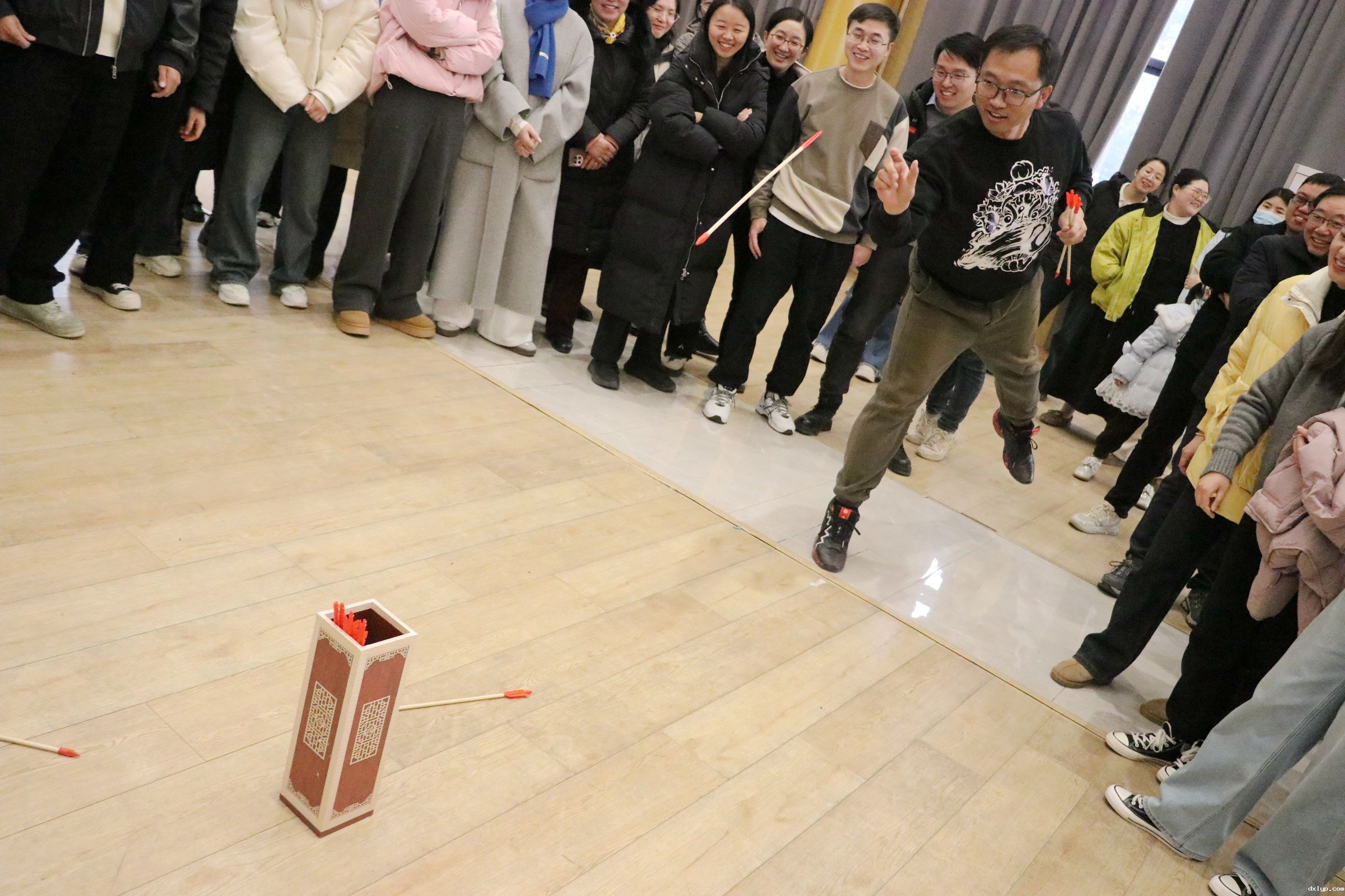 艺术馆内,一圈到底的比赛同样扣人心弦,各团队成员手牵手围成圈,呼啦圈在他们之间快速穿梭,大家目光专注、动作敏捷。投壶比赛现场则充满了技巧与专注,选手们站在起点线后,手持箭矢,屏气凝神,每一次命中都引发阵阵喝彩。