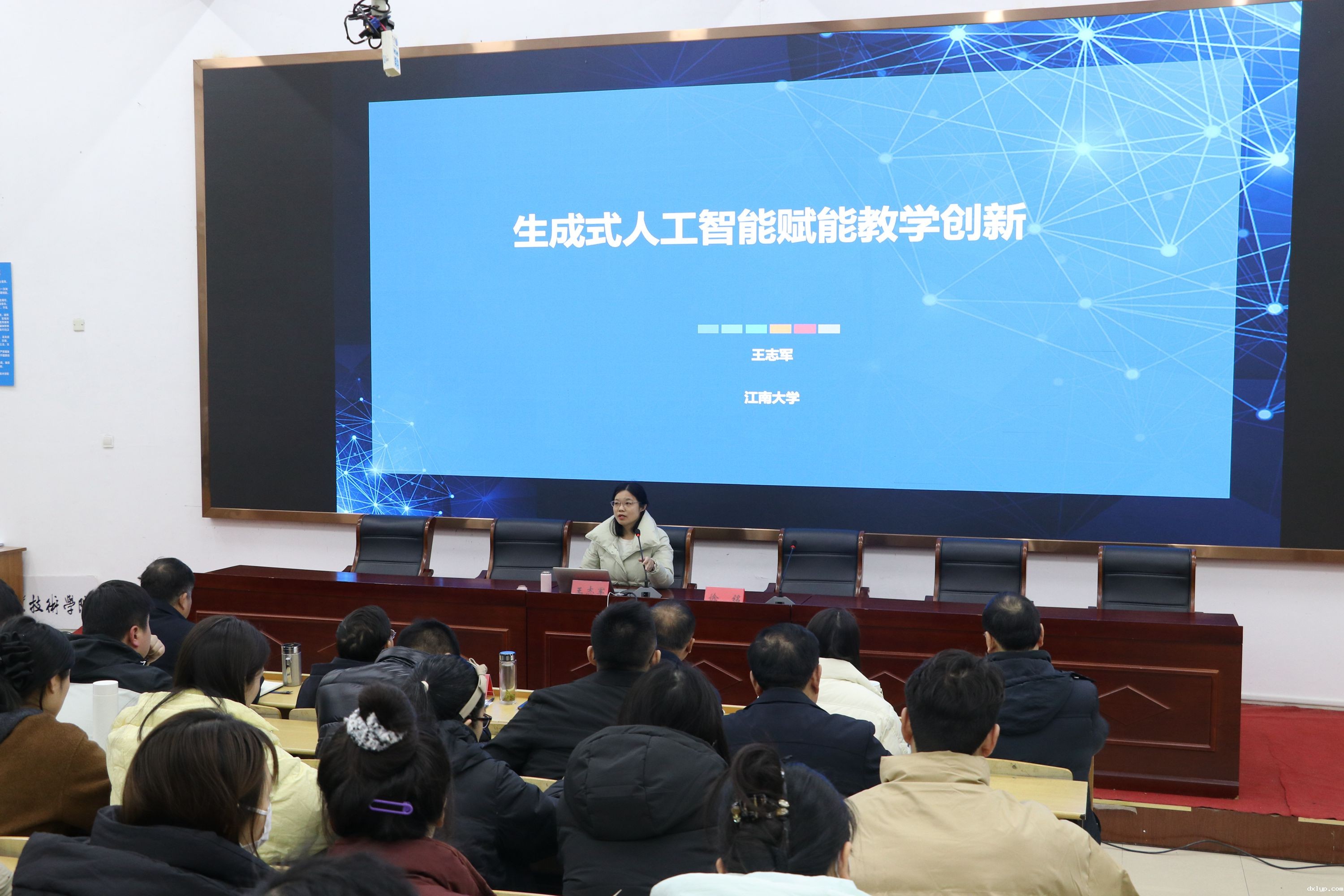 会议首项议程由江南大学人文学院教育技术系教授、博士生导师王志军作信息化技术应用培训。王教授以《生成式人工智能赋能教学创新》为题,结合其丰富的学术成果和实践经验,系统阐释了生成式人工智能在教育领域的应用场景及其对教学效率、质量的提升作用。她指出,AI技术不仅能够优化课程设计、个性化学习支持,还能推动教育模式的数字化转型。王教授还分享了其在联通主义学习理论、数智化教学创新等领域的研究成果,为全体教职工提供了前沿的理论指导和实践启示。
